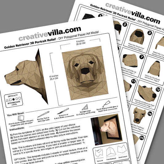 Golden Retriever Dog 3D Portrait Wall Sculpture DIY Low Poly Paper Model Template, Paper Craft