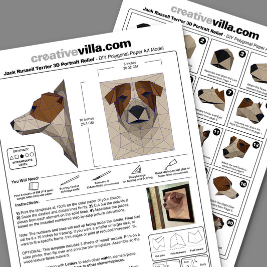 Jack Russel Dog 3D Portrait Wall Sculpture DIY Low Poly Paper Model Template, Paper Craft