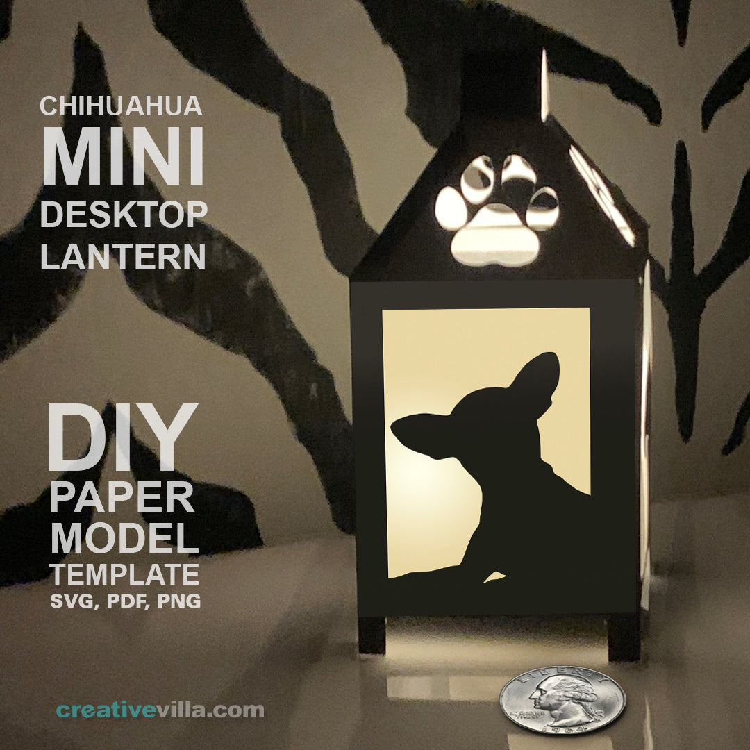 Chihuahua Mini Desktop Lantern DIY Low Poly Paper Model Template for download (Cricut compatible). Simply print the templates, score the fold lines, cut the pieces out, and then glue and assemble to create your very own mini Dog Lantern/Night Light. Print on any color of your choice to create multiple versions. Add a battery operated votive light to illuminate! Have a Dog breed request? Let us know!