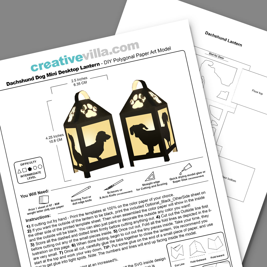 Dachshund Dog Mini Desktop Lantern DIY Low Poly Paper Model Template for download (Cricut compatible). Simply print the templates, score the fold lines, cut the pieces out, and then glue and assemble to create your very own mini Dog Lantern/Night Light. Print on any color of your choice to create multiple versions. Add a battery operated votive light to illuminate! Have a Dog breed request? Let us know!