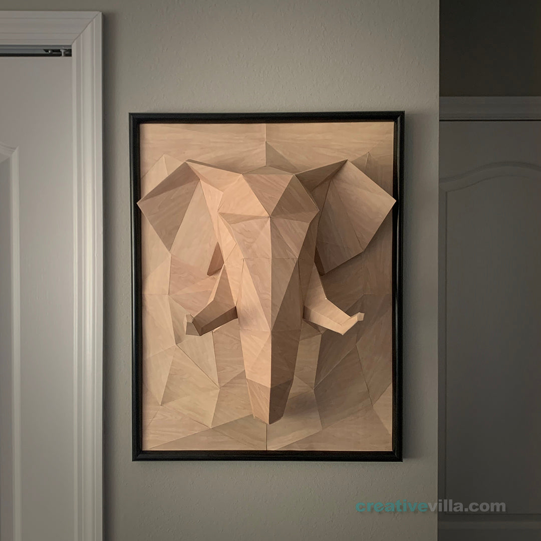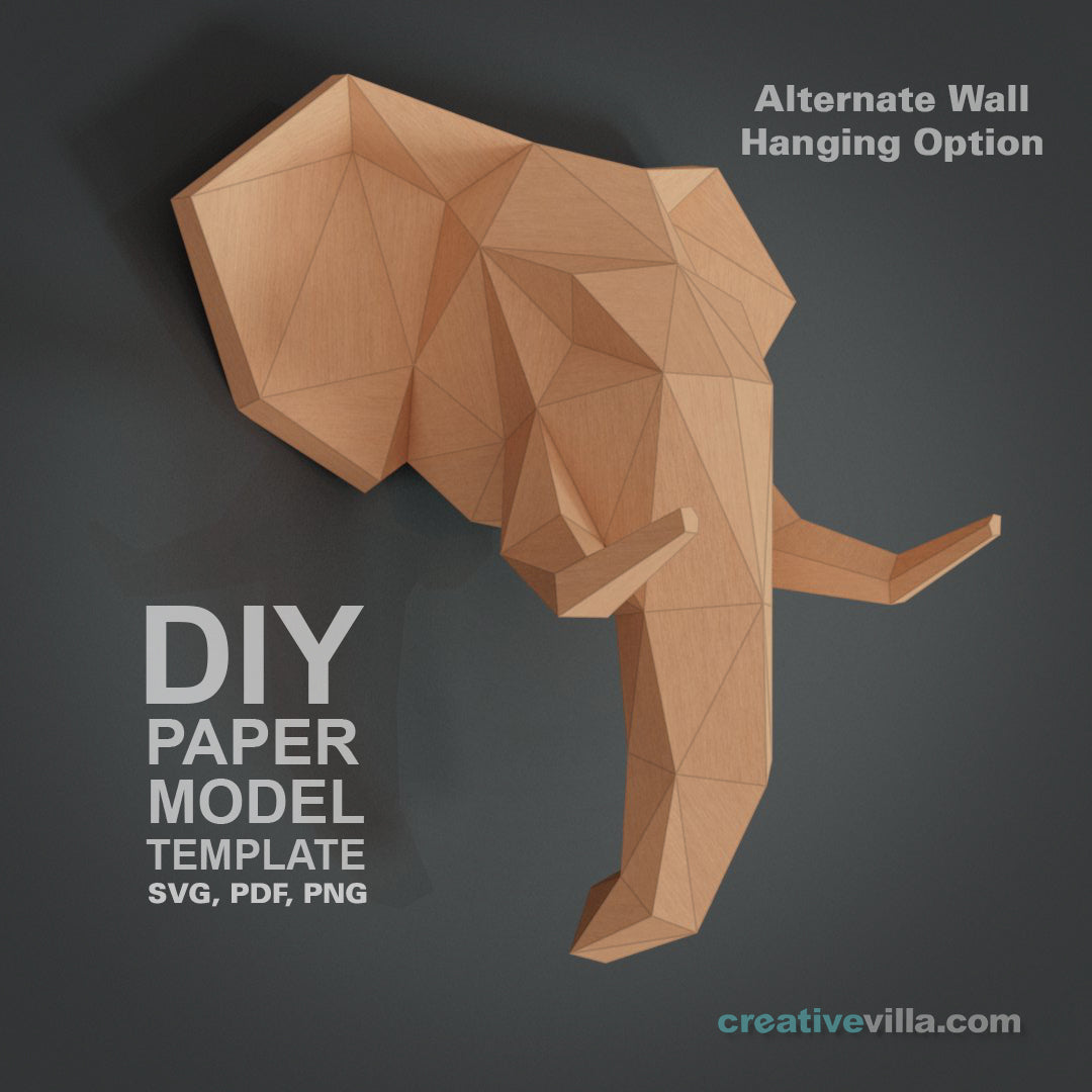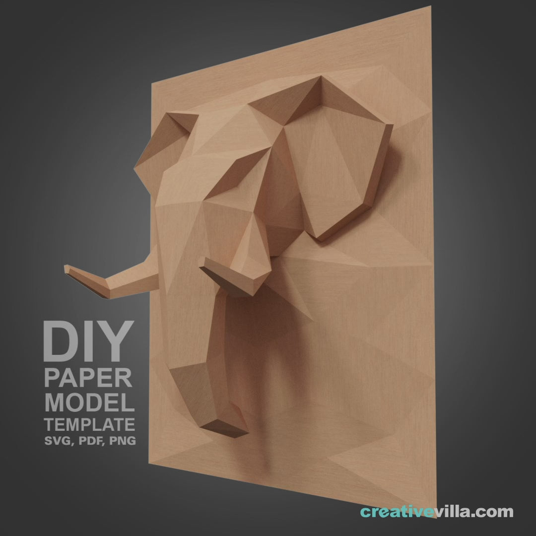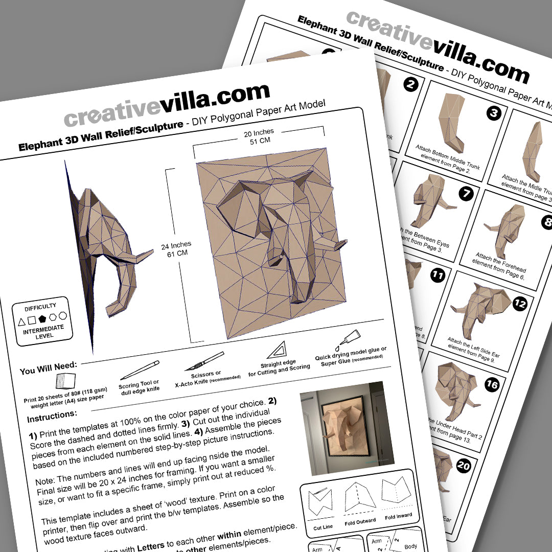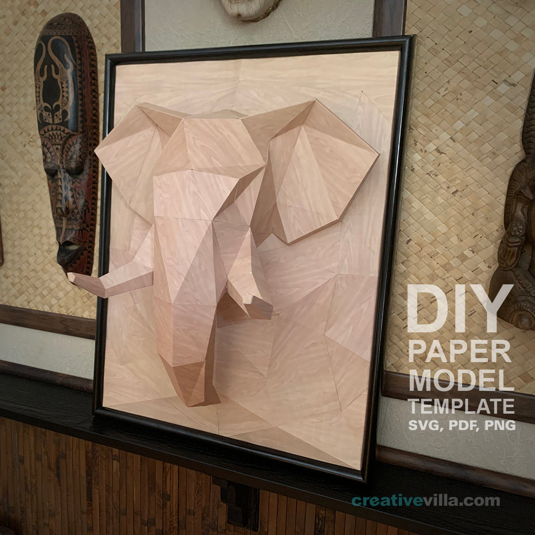 Elephant 3D Relief Wall Sculpture DIY Low Poly Paper Model Templates for download. Simply print the templates, score the fold lines, cut the pieces out, and then glue and assemble to create a 20 x 24 inch frame-able relief wall sculpture. Print on any color of your choice. OR print the included Wood Texture page on a color printer on one side, then flip it over, and print the templates on the other side - so when complete the outside color of the wall hanging looks like wood.