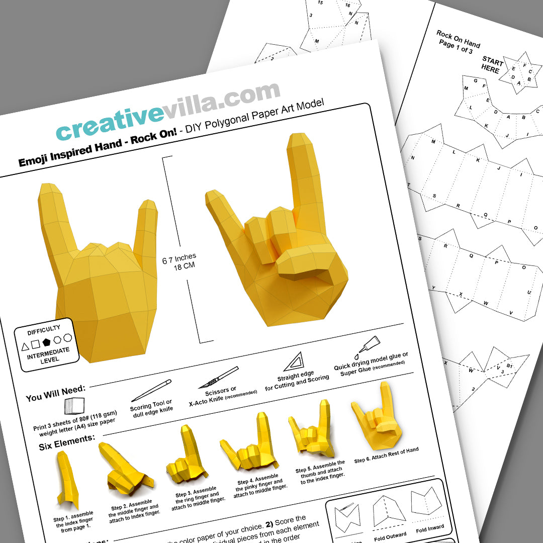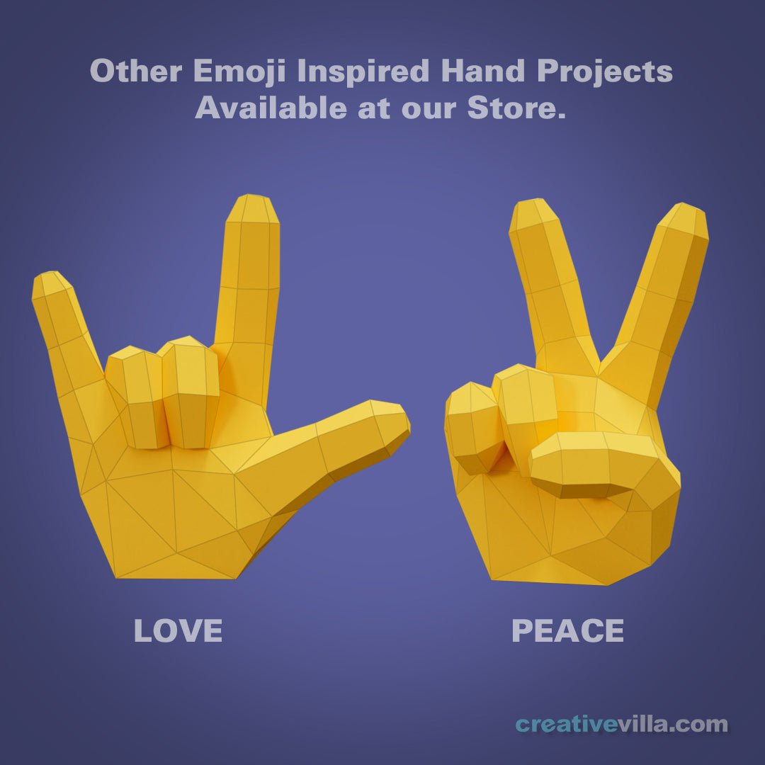 Emoji inspired Hand - Rock On! - DIY Low Poly Paper Model Template, Paper Craft for download. Simply print the templates, score the fold lines, cut the pieces out, and then glue and assemble to create your very own Rock On! Hand.