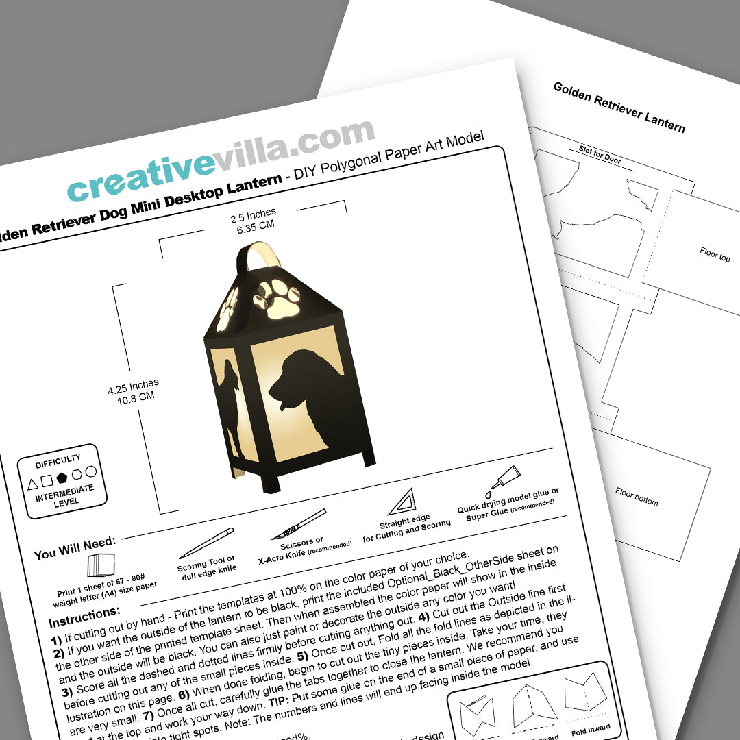 Golden Retriever Dog Mini Desktop Lantern DIY Low Poly Paper Model Template for download (Cricut compatible). Simply print the templates, score the fold lines, cut the pieces out, and then glue and assemble to create your very own mini Dog Lantern/Night Light. Print on any color of your choice to create multiple versions. Add a battery operated votive light to illuminate! Have a Dog breed request? Let us know!