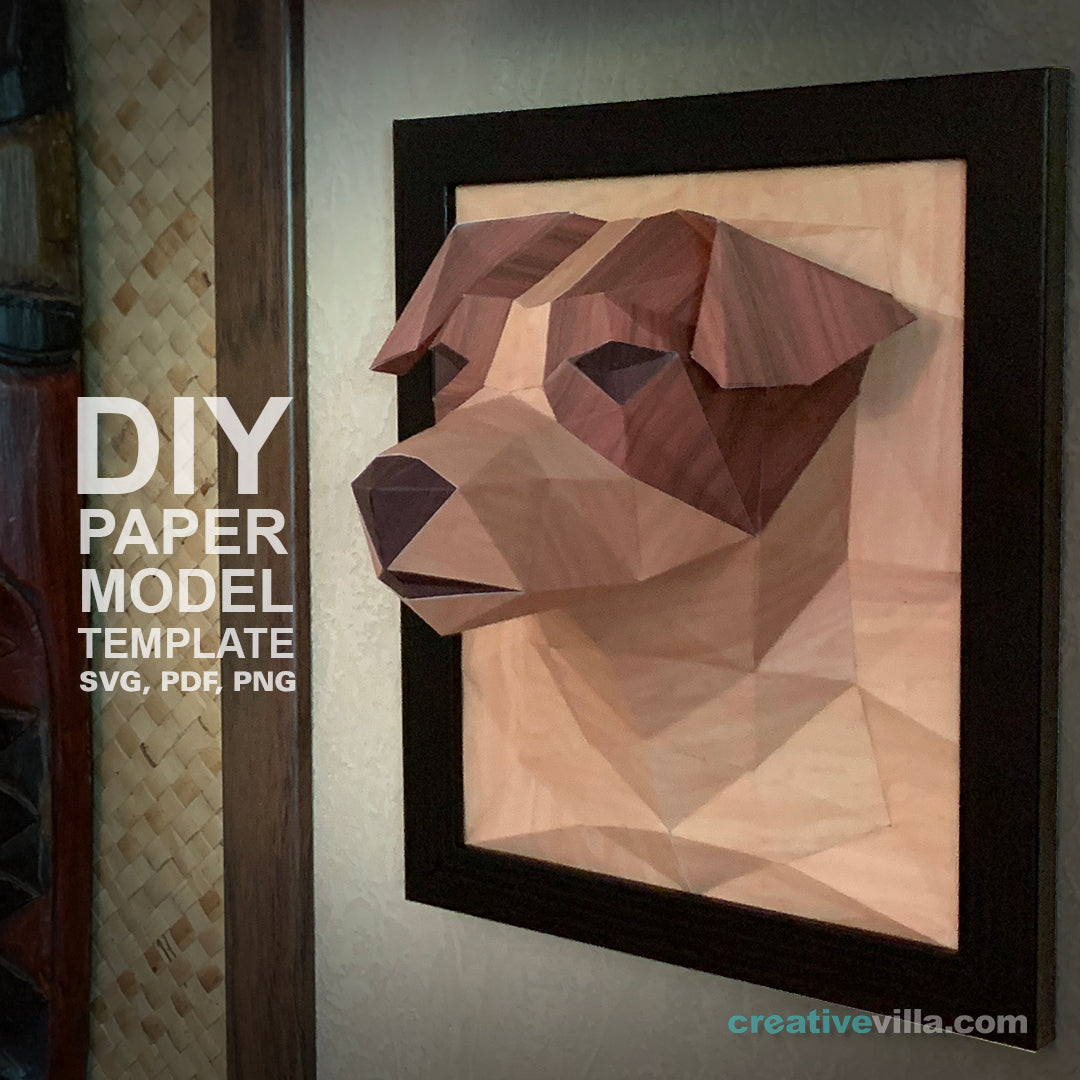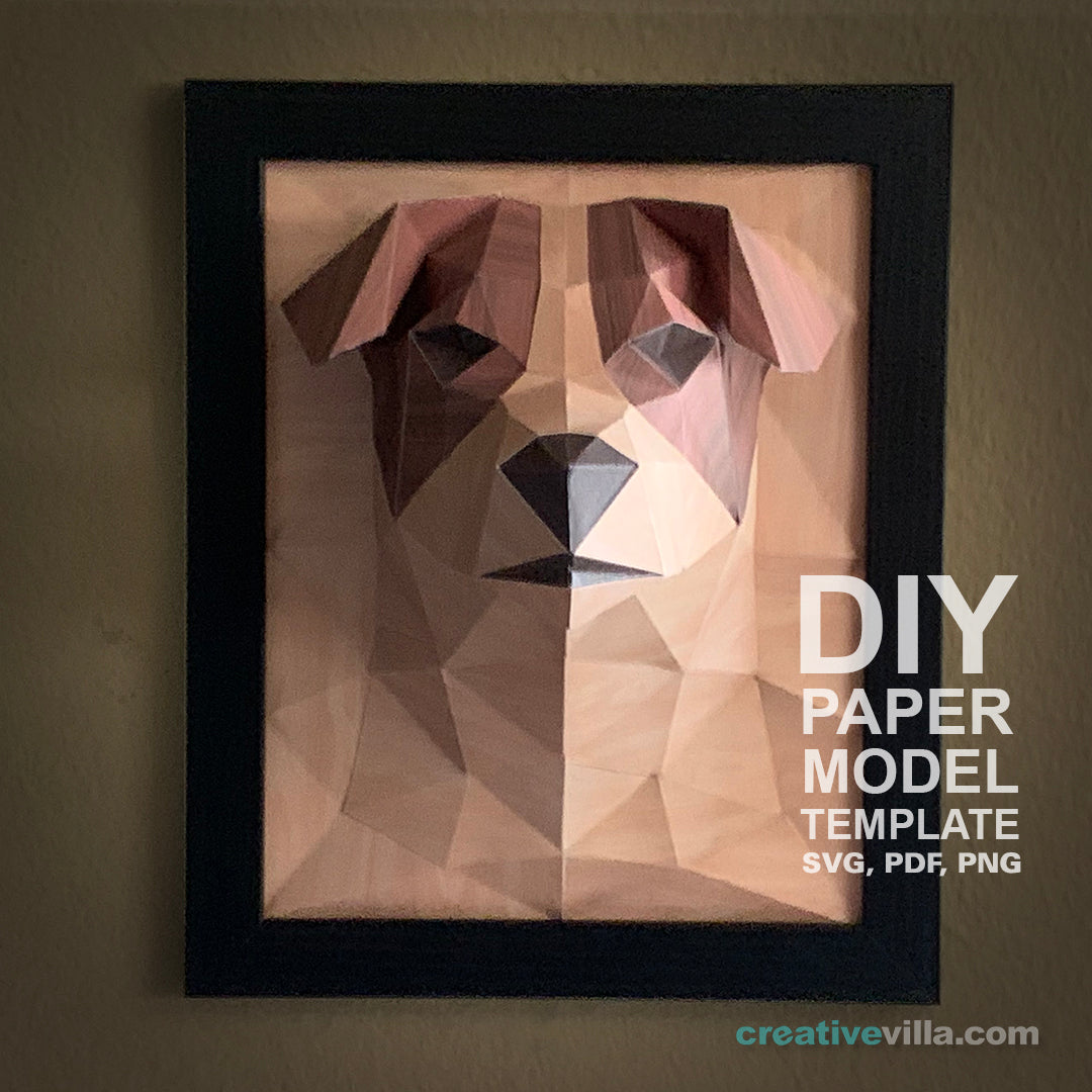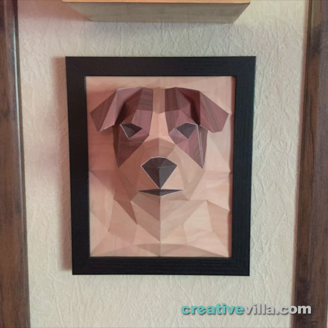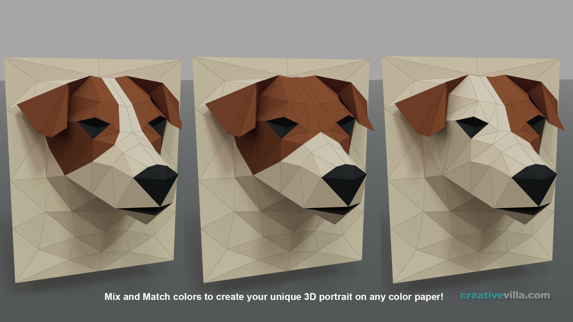 Jack Russell Dog 3D Portrait Wall Sculpture DIY Low Poly Paper Model Templates for download. Simply print the templates, score the fold lines, cut the pieces out, and then glue and assemble to create amn 8 x 10 inch frame-able relief wall sculpture. Print on any color of your choice. OR print the included Wood Texture pages on a color printer on one side, then flip it over, and print the templates on the other side - so when complete the outside color of the wall hanging looks like wood.