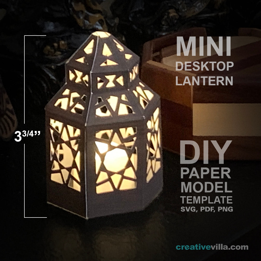 Mini Desktop Lantern #1 DIY Low Poly Paper Model Templates for download. Simply print the templates, score the fold lines, cut the pieces out, and then glue and assemble to create your very own mini desktop lantern. Print on any color of your choice to create multiple versions. Add a battery operated votive to illuminate!