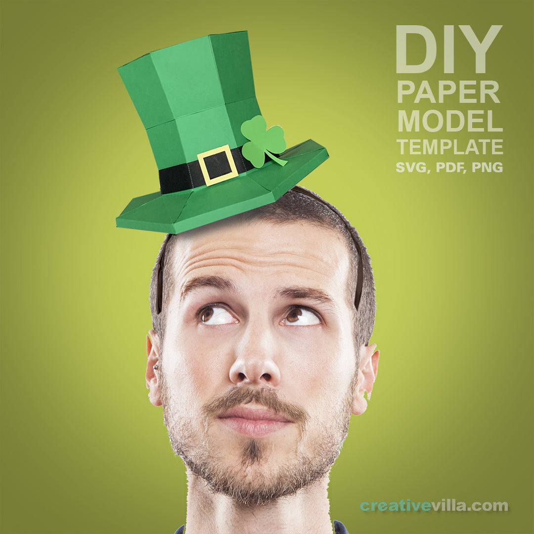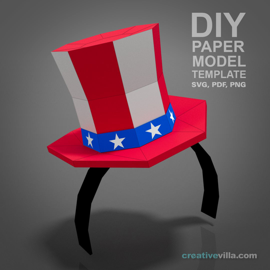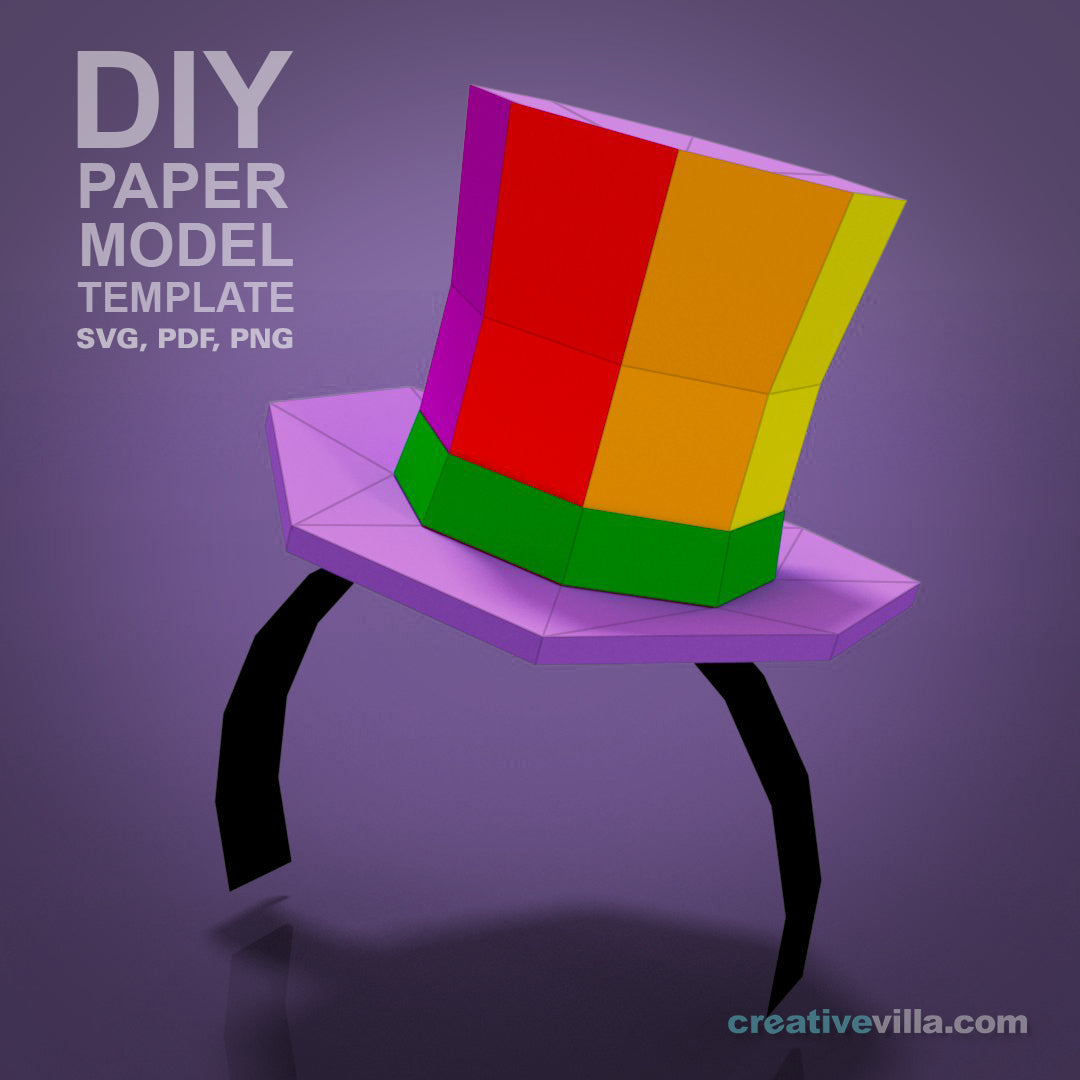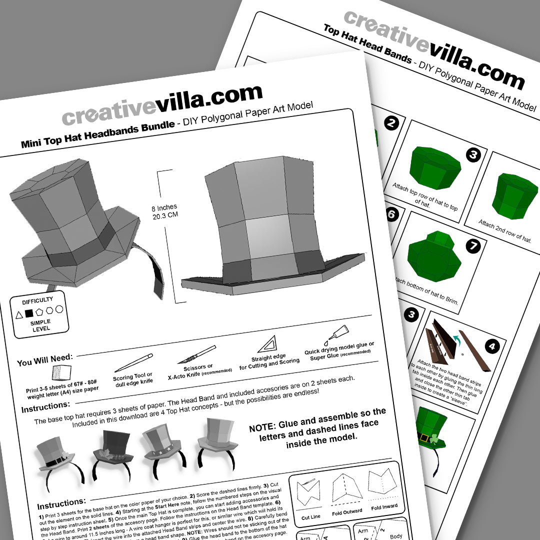 Mini Top Hat Head Band DIY Low Poly Paper Model Template contains templates for the base hat, head band as well as several themed accessories. Simply print the templates, score the fold lines, cut the pieces out, and then glue and assemble to create your very own Mini Top Hat which you can decorate then attach to a head band to wear to any occasion. Print on any color you choose or use our recommended color ideas. Includes step by step visual instructions.
