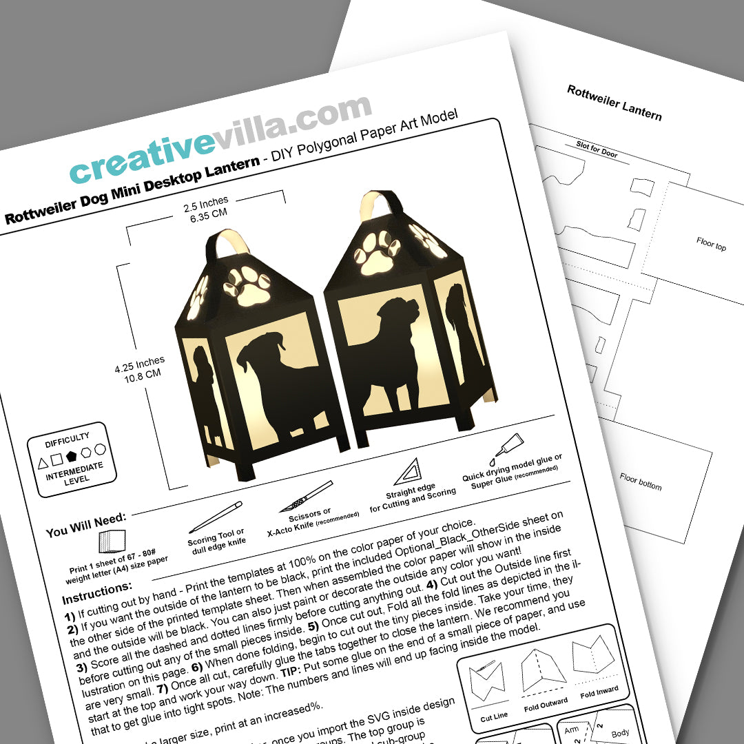 Rottweiler Dog Mini Desktop Lantern DIY Low Poly Paper Model Template for download (Cricut compatible). Simply print the templates, score the fold lines, cut the pieces out, and then glue and assemble to create your very own mini Dog Lantern/Night Light. Print on any color of your choice to create multiple versions. Add a battery operated votive light to illuminate! Have a Dog breed request? Let us know!